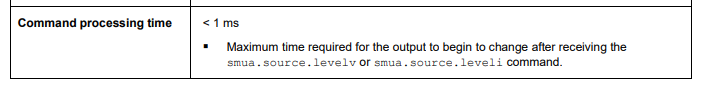 Comment 2: I actually know that 1 usec reading rates are way too fast for this equipment. I don't think that the equipment limitation is the biggest challenge for me, It looks like that my script in Python has an intrinsic execution time (running in my computer) that acts like a "bottleneck", limmiting my measure speed. I would like to know the most optimized way that I could build my software so I can make customizable scripts that run fast. With your vast experience, could you help me with any suggestion? Maybe running the scripts in the internal memory of the Keithley, I don't know. I also found this time spec in the datasheet (image attachment), It looks like it's the maximum time that the instrument needs to process the command and update the output, <1ms is still OK to me if I could make my software send the signals to update faster than that.